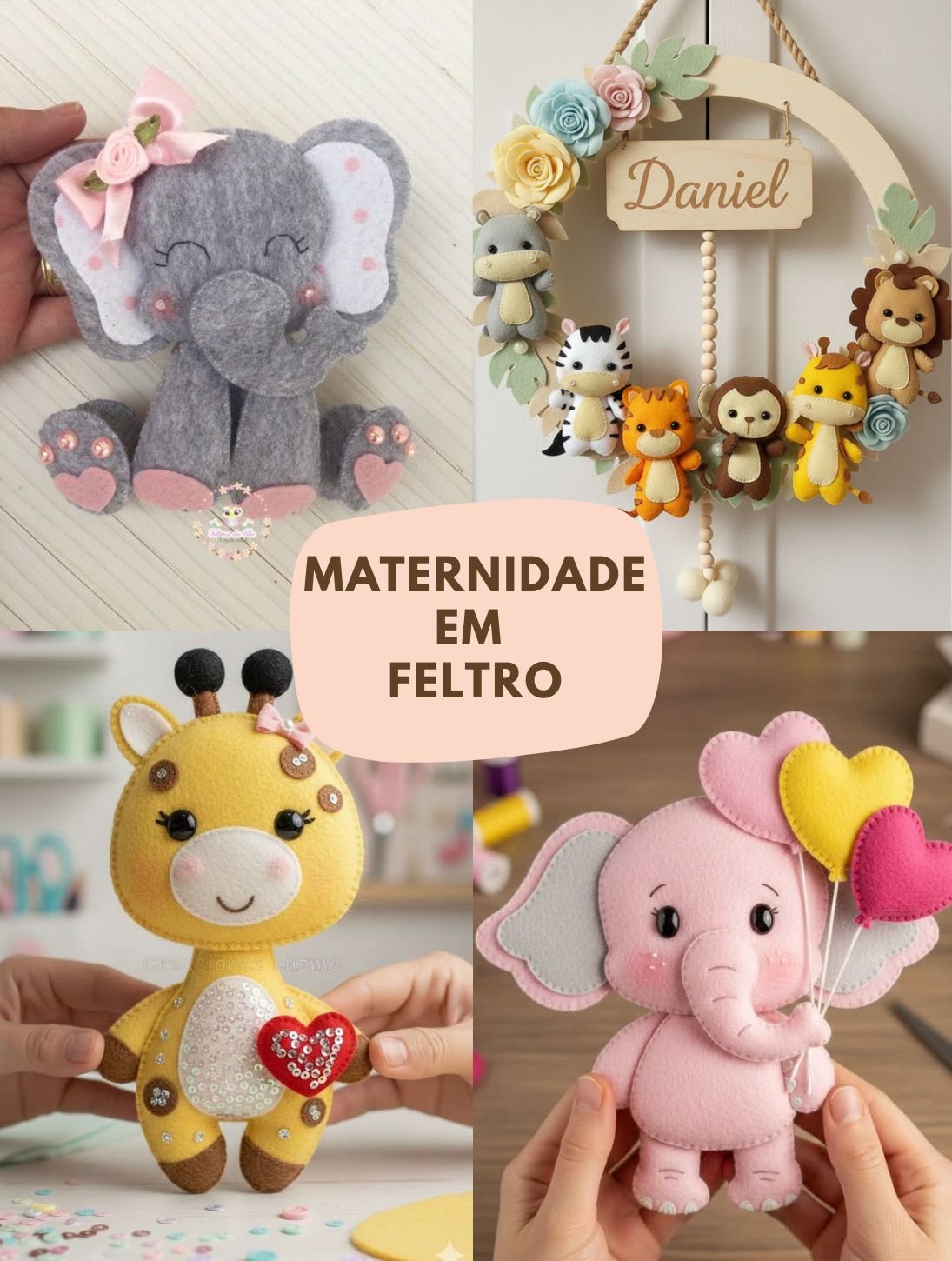 Nossos moldes foram criados para facilitar sua vida. Basta imprimir, cortar o feltro e costurar. É a forma mais rápida de criar peças de Alto Valor como Guirlandas e Porta Maternidade.